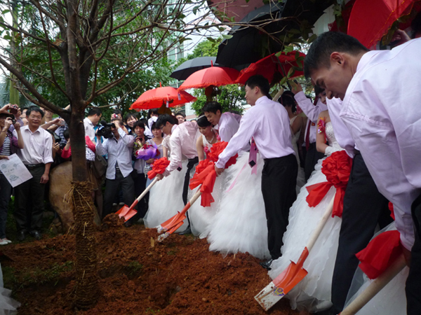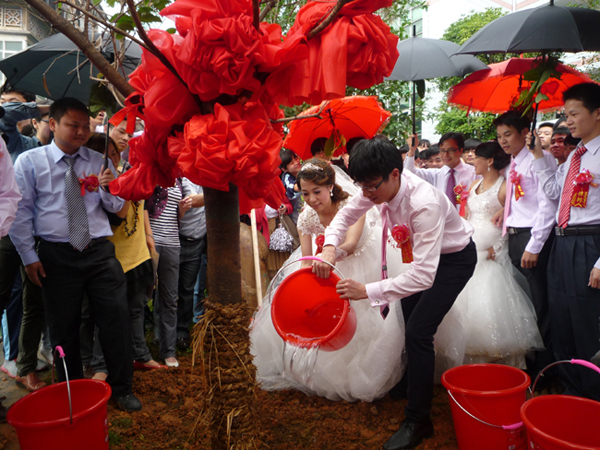 下午3時(shí)30分,載滿(mǎn)新人與親友嘉賓的10輛花車(chē)依次駛?cè)胄@,七對(duì)新人在全校師生的歡呼聲中留影校園并種植具有象征意義的長(zhǎng)青樹(shù),隨后花車(chē)巡游河?xùn)|前往牡丹大酒店。