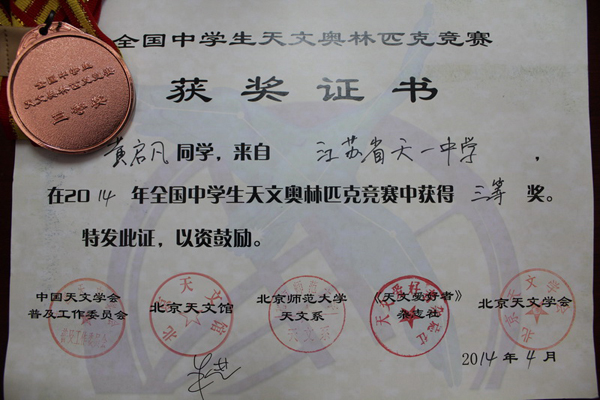 另,在4月16日—4月20日于北京成功舉辦的2014年全國中學(xué)生天文奧賽決賽中,黃啟凡同學(xué)經(jīng)過理論筆試、目視觀測實測、望遠(yuǎn)鏡觀測實測等各個科目的比賽后,最終奪得了低年組銅牌的好成績!