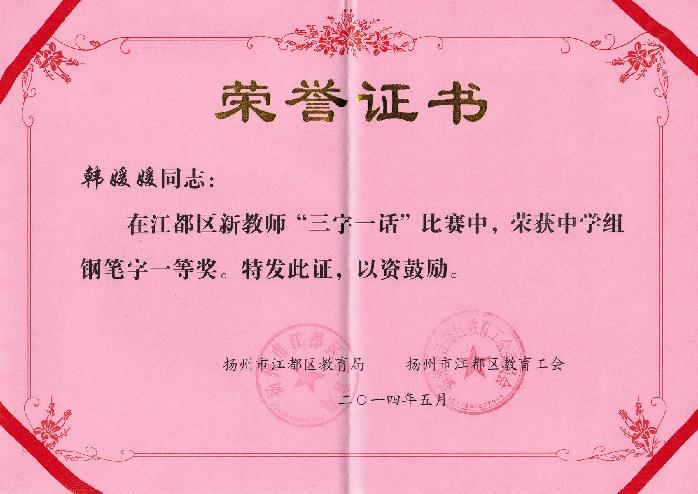 樊川中學(xué)2013年新分配教師韓媛媛在江都區(qū)教育局及江都教育工會組織的新教師“三字一話”比賽中,榮獲中學(xué)組鋼筆字一等獎。