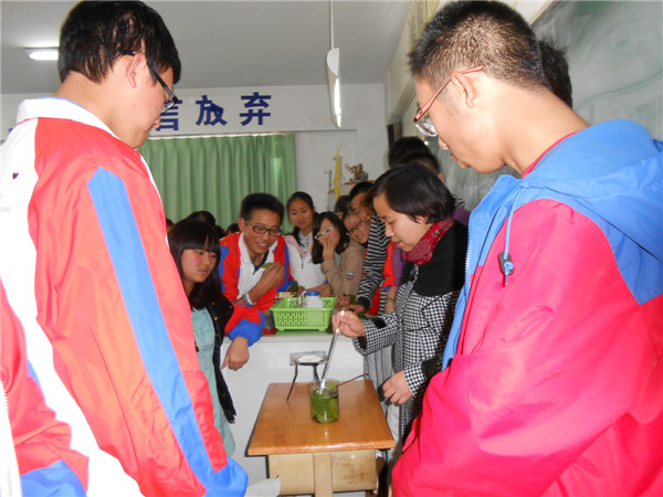 在多次在化學(xué)實驗室反復(fù)實驗基礎(chǔ)上,魏宇衡、晏子瑜同學(xué)帶領(lǐng)十多名化學(xué)粉絲設(shè)計和搭建好化學(xué)實驗裝置后,勇敢的劉老師在同學(xué)們期待的目光和鏡頭下中打開了鐵夾,頓時,粉紅色的噴泉如期而至!政治老師來做化學(xué)實驗,老師同學(xué)們都很激動,各種拍照聲響成一片?;瘜W(xué)愛好者們計劃以后要設(shè)計更多更復(fù)雜的噴泉,讓大家欣賞到更多奇妙精彩的化學(xué)現(xiàn)象。