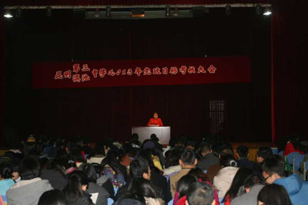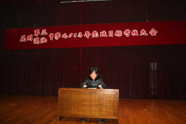2014年1月18日早10:30分,我校召開昆明三中、昆明滇池中學2013年黨政目標考核大會,組織人事處胡處長、審計處王處長一行到我校進行黨風廉政考評,胡處長為全校教職工進行了考評要求的發(fā)言,我校校黨委書記董蘋代表學校領(lǐng)導班子進行了匯報工作,考評中全體教職工對每個校級領(lǐng)導都給予了認真的評價。