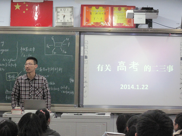 2014年1月22日晚6:30,我校2010級優(yōu)秀畢業(yè)生,北京大學(xué)的楊詩翰、浙江大學(xué)的于思瀛和王惠如三位同學(xué),走進(jìn)高三教室,與師弟師妹分享經(jīng)歷高考后的體會,交流高三下學(xué)期的備考策略以及半年大學(xué)生活的感受,鼓勵(lì)師弟師妹們堅(jiān)定信心、認(rèn)準(zhǔn)目標(biāo)、合理規(guī)劃,祝福大家2014年高考成功、進(jìn)入理想的大學(xué)。