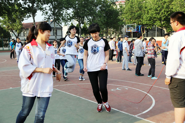 5分鐘比賽時間內,每個班級8名男生8名女生的參賽隊伍排成“8”字長龍,齊心協(xié)力,默契配合。微笑的面龐、矯健的身影、利落的動作、熱情的吶喊,讓整個運動場洋溢著青春的活力。兩名搖大繩的同學既要動腦指揮,又要拼體力,保證跳繩既快又穩(wěn),不失誤。接力跳繩比賽既是對選手技術毅力的考驗,又是對各班級團結協(xié)作和拼搏精神的體現(xiàn)。部分班主任及青年教師聯(lián)合會部分教師也積極參與到比賽中,掀起了運動場的歡呼高潮。