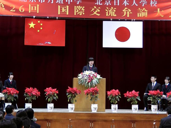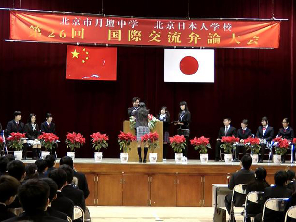 2013年11月30日,第26屆國(guó)際交流演講大會(huì)在北京日本人學(xué)校隆重舉行,北京月壇中學(xué)初三年級(jí)的部分師生由張文生校長(zhǎng)帶隊(duì)參加了這次大會(huì)。北京國(guó)際交流演講大會(huì)是由北京月壇中學(xué)與北京日本人學(xué)校聯(lián)合舉辦的兩校傳統(tǒng)聯(lián)宜活動(dòng),每年輪流舉行,目的在于促進(jìn)兩校之間的友好合作、共同發(fā)展,增進(jìn)兩國(guó)學(xué)生之間理解和友誼。