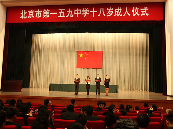 2014年2月28日,北京市第一五九中學(xué)在國家政協(xié)禮堂舉行了成人宣誓儀式,學(xué)校的領(lǐng)導(dǎo)、教師、高三年級全體學(xué)生及學(xué)生家長近500人,穿著正裝出席了隆重的18歲成人儀式。校長李亞明及學(xué)校的各級領(lǐng)導(dǎo)參加了此次會(huì)議。