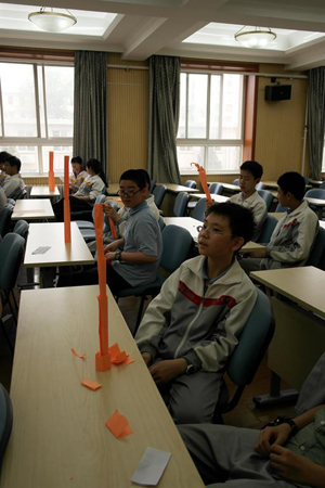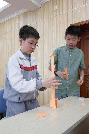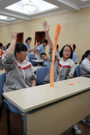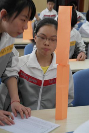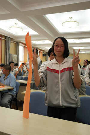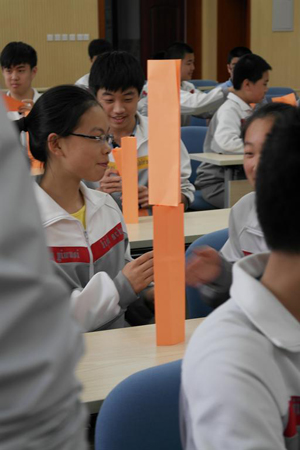 本次競賽的任務(wù)是在10分鐘之內(nèi),以兩個(gè)人為一個(gè)小組,利用現(xiàn)場提供的兩張A4紙,搭建一個(gè)紙結(jié)構(gòu)。要求完成的結(jié)構(gòu)要盡可能高的豎立在桌面上,結(jié)構(gòu)只能與桌面接觸,不得再接觸其它任何東西(包括人體)。制作時(shí)間到,裁判逐個(gè)依次測量結(jié)構(gòu)的高度。結(jié)構(gòu)的高度為結(jié)構(gòu)頂端到桌面的垂直距離,若結(jié)構(gòu)高度一致,以用時(shí)最短者為優(yōu)勝。