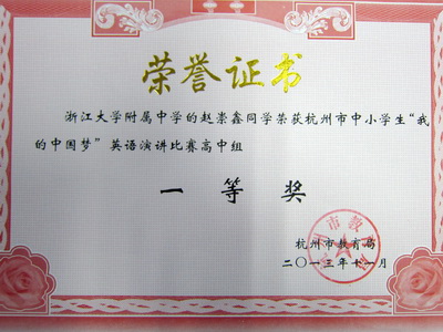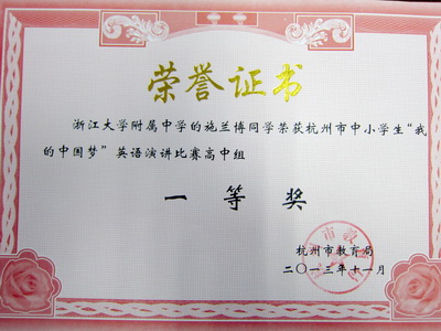 杭州市教育局從9月份起,在全市中小學(xué)生中組織開展了以“我的中國(guó)夢(mèng)”為主題的英語(yǔ)征文和演講比賽。經(jīng)學(xué)校推薦,市教育局組織專家對(duì)演講征文進(jìn)行評(píng)審,并現(xiàn)場(chǎng)進(jìn)行演講比賽,我校喜獲佳績(jī)。獲獎(jiǎng)名單如下: