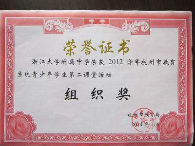 因我校學(xué)生第二課堂活動(dòng)工作突出,經(jīng)杭州市第二課堂活動(dòng)工作領(lǐng)導(dǎo)小組綜合考評(píng),我校榮獲2012學(xué)年杭州市教育系統(tǒng)與杭州市青少年第二課堂活動(dòng)優(yōu)秀組織獎(jiǎng)。