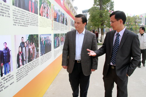 李長春局長一行首先參觀了我校初中部校園。王錫文校長向其介紹了目前學校正在進行的目標導引下的小組合作學習和藝術模塊教學。對于小組合作學習,李局長表示,這種新的教育教學方式極大地促進了學生的自主性學習,培養(yǎng)了團隊合作意識,有利于學生各方面的成長。李局長在初中部教學樓架空層,看到學生們在藝術模塊課上完成的的書法、陶藝作品非常高興,表示一中在中高考的壓力下真正實現(xiàn)了發(fā)展每個學生個性特長的教育教學目標。