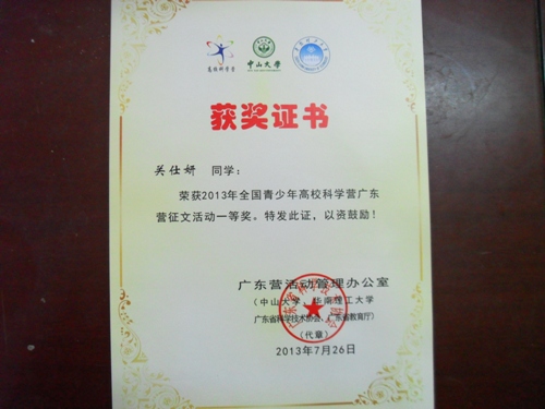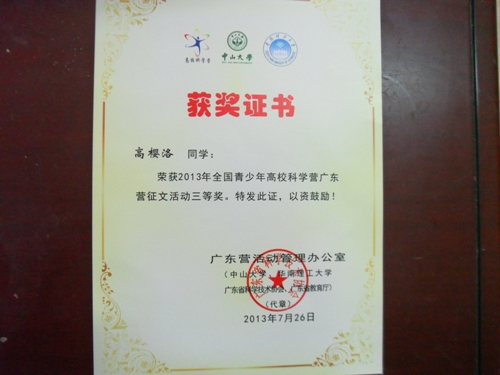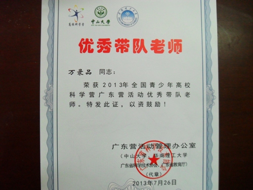 活動結(jié)束時全體400多名營員參加了科學(xué)營征文比賽,最終評出一等獎5篇、二等獎10篇、三等獎20篇。我校關(guān)仕妍同學(xué)的《科技之旅,繽紛無限》獲得一等獎,高櫻洛同學(xué)獲得三等獎,文章刊登在《廣東科技報?中小學(xué)科教周刊》上。由于萬錄品老師帶領(lǐng)一中科學(xué)營隊(duì)員取得一系列突出成績,所帶團(tuán)隊(duì)獲得最佳團(tuán)體獎,萬錄品老師被省科協(xié)和省教育廳評為優(yōu)秀帶隊(duì)老師。