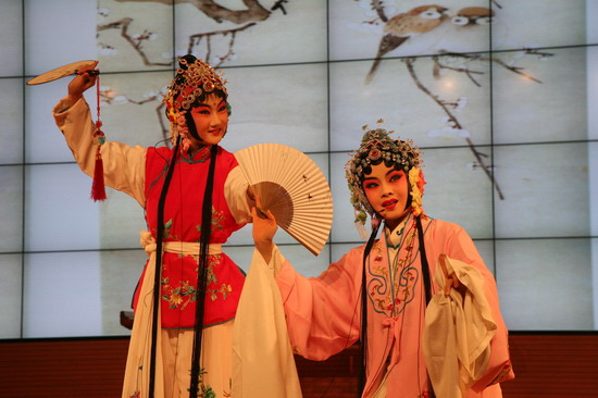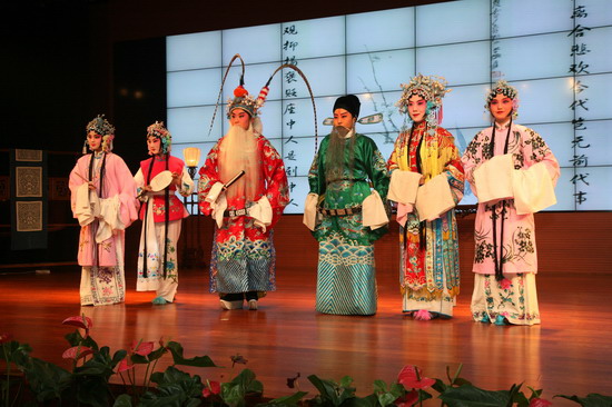 隨后由實驗中學京劇社和歷屆畢業(yè)生聯(lián)袂奉獻的“梨園溢彩”主題演出,更是把600年昆曲,200年京劇的精髓表現(xiàn)的淋漓盡致。牡丹亭《游園》詮釋了昆曲之雅,之美,贏得現(xiàn)場專家的連聲叫好。隨之而來的生、旦、凈、丑經典劇目表演,更是把師生引入戲曲的世界,引入京劇的情境。在校學生和畢業(yè)生攜手,女老生獻藝,實驗“四大名旦”齊聚,兩位包公護駕,讓學生大呼過癮,同時也讓他們在欣賞中了解京昆藝術。吳荻老師現(xiàn)場書法的串場,樊后君老師帶領高二學生的吟誦,畫龍點睛,異常精彩。特約京劇丑角表演更是把整場演出推向高潮,也在歡笑中闡釋了戲曲的玄妙。中國京劇院吳江院長不僅做出了精彩點評,還同蔡曉東校長一起為吳荻老師頒發(fā)“吳荻非物質文化遺產傳承工作室”牌匾,以激勵吳老師為傳承中華傳統(tǒng)文化再接再厲。