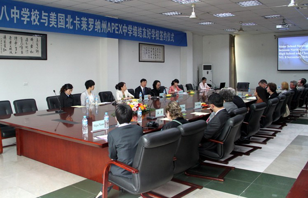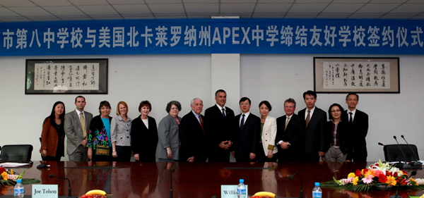 該代表團此行的目的是為了見證重慶八中與APEX中學(xué)締結(jié)友好學(xué)校。APEX是一所擁有2300余名學(xué)生,400余位教師的大型中學(xué),在該州的學(xué)術(shù)地位與聲譽與我校相當。