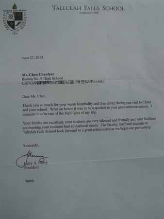 您的全體教師們都非常優(yōu)秀,學(xué)生們則友好且才華橫溢,學(xué)校的各項(xiàng)設(shè)施都滿足了學(xué)生們的最佳教學(xué)需要。從我們雙方的合作開始,塔盧拉弗中學(xué)的全體教職員工和學(xué)生,都十分期待我們將來能有更多更好的聯(lián)系。