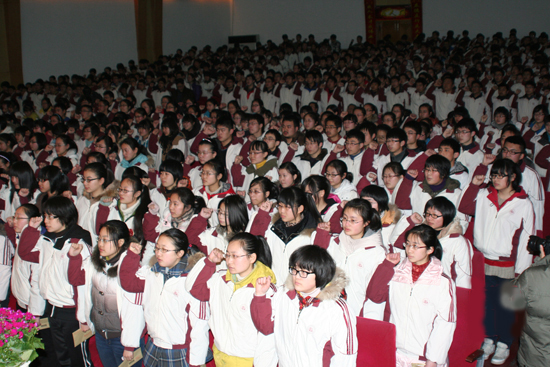 成錦平校長(zhǎng)的致詞以春天般的詩(shī)意開(kāi)篇,“在這春回大地、孕育希望的美好季節(jié)。我們隆重集會(huì),舉行莊嚴(yán)的青春盛典——江蘇省南通一中2012屆高三成人宣誓暨高考沖刺誓師大會(huì)。全體一中人以實(shí)際行動(dòng)又一次譜寫(xiě)了學(xué)校發(fā)展史上的新篇章?!?br />