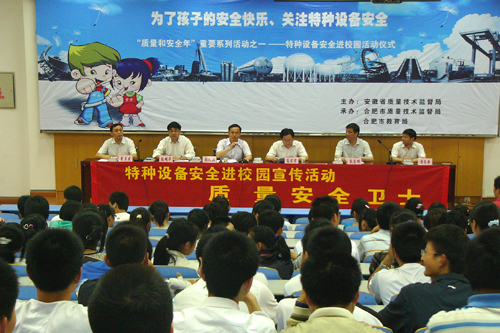 為了落實(shí)國務(wù)院開展“質(zhì)量和安全年”活動(dòng)要求,更好的在中學(xué)生中廣泛宣傳普及特種設(shè)備安全知識,5月26日下午,省、市質(zhì)量監(jiān)督部門、合肥市教育局聯(lián)合舉辦的“特種設(shè)備安全進(jìn)校園”宣傳活動(dòng)啟動(dòng)儀式在我校多媒體教室隆重舉行,安徽省質(zhì)量技術(shù)監(jiān)督局高宗宏副局長、合肥市質(zhì)量技術(shù)監(jiān)督局閔義山局長、合肥市教育局朱志明副局長、合肥市質(zhì)量技術(shù)監(jiān)督局黃長安副局長等領(lǐng)導(dǎo)出席啟動(dòng)儀式,合肥九中校長陳明華作了主旨發(fā)言,合肥九中高一將近300名學(xué)生參加了現(xiàn)場活動(dòng)。