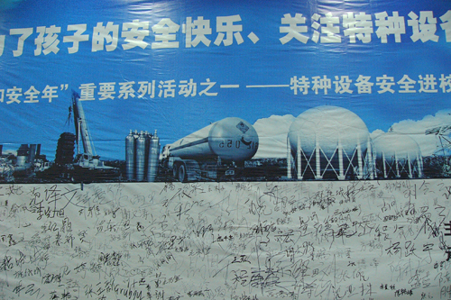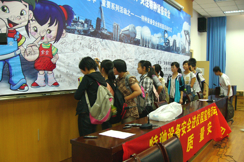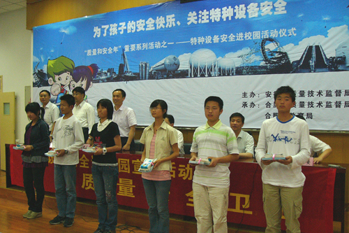 隨后,安徽省、合肥市質(zhì)量技術(shù)監(jiān)督局、合肥市教育局向我校贈(zèng)送特種設(shè)備安全知識畫冊、教育片、法規(guī)宣傳等資料,組織學(xué)生觀看了特種設(shè)備安全進(jìn)校園教育片,整個(gè)宣傳活動(dòng)在學(xué)生爭做“質(zhì)量安全小衛(wèi)士”集體簽名活動(dòng)中結(jié)束。
