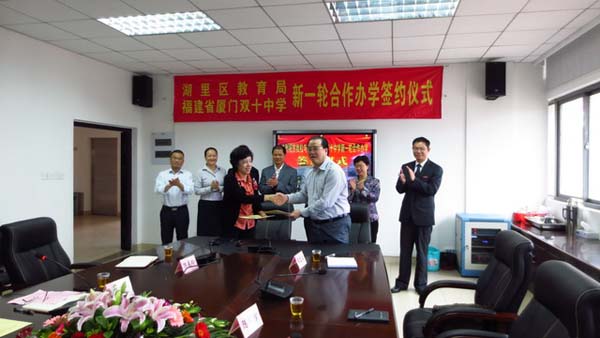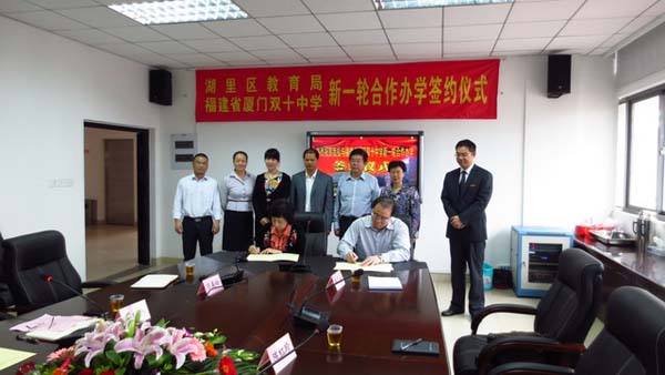 4月19日,我校與湖里實(shí)驗(yàn)中學(xué)新一輪合作辦學(xué)簽約儀式如期舉行。在湖里實(shí)驗(yàn)中學(xué)寬敞明亮的會(huì)議室里,湖里區(qū)教育局陳媛局長(zhǎng)、向延瓊副局長(zhǎng)、湖里實(shí)驗(yàn)中學(xué)王明杰校長(zhǎng)及我校陳文強(qiáng)校長(zhǎng)、陳紅珍副校長(zhǎng)、思明分校黃學(xué)斌校長(zhǎng)等領(lǐng)導(dǎo)歡聚一堂,暢談了兩校合作的經(jīng)驗(yàn),展望了繼續(xù)合作的前景,陳媛局長(zhǎng)和陳文強(qiáng)校長(zhǎng)分別代表湖里區(qū)教育局和雙十中學(xué)在合作辦學(xué)協(xié)議書上簽字。