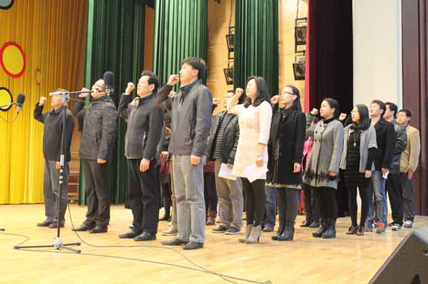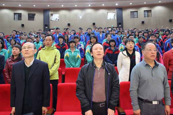 此時(shí),全場(chǎng)起立齊唱校歌,師生們以嘹亮的歌聲來(lái)表達(dá)他們誓創(chuàng)大學(xué)城輝煌的堅(jiān)定意志。誓師大會(huì)在歌聲中落下帷幕。