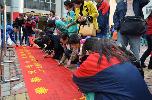 高三年級(jí)在會(huì)場(chǎng)外還為每班準(zhǔn)備了一條印有“拳拳父母心,殷殷師長(zhǎng)情”字樣的紅色條幅,請(qǐng)家長(zhǎng)與老師為學(xué)生寫下鼓勵(lì)與祝福的話語(yǔ),作為學(xué)生奮進(jìn)的動(dòng)力源泉。