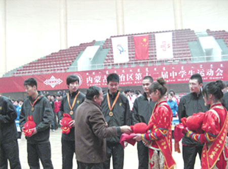 自治區(qū)教育廳體育處原處長楊文舉為包頭三十三中男籃頒獎