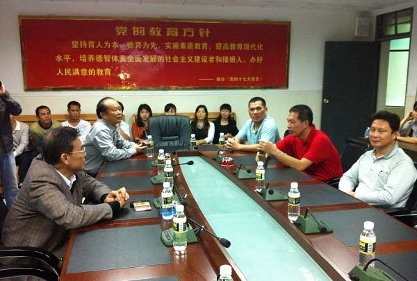 2012年11月18日早上,??谑杏琅d中學校長和老師蒞臨我校交流指導(dǎo)。我校校長潘正懷親自接待并帶領(lǐng)各位領(lǐng)導(dǎo)老師參觀校園,詳細介紹我校校園建設(shè)的情況。