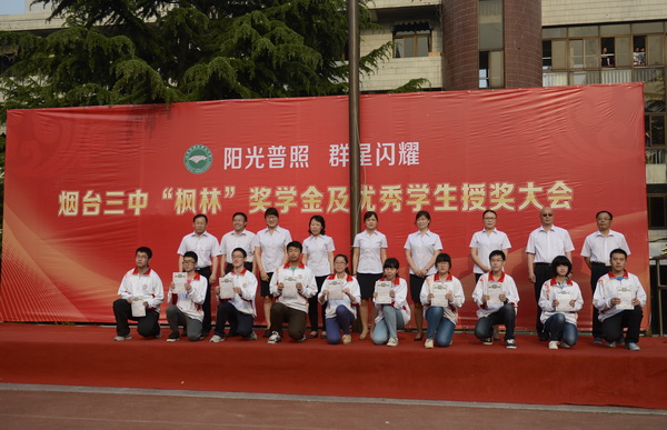 5月22日,我校隆重舉行“陽(yáng)光普照 群星閃耀”——煙臺(tái)三中第五屆‘楓林’獎(jiǎng)學(xué)金及優(yōu)秀學(xué)生授獎(jiǎng)大會(huì)。山東楓林集團(tuán)副總經(jīng)理杜廣遠(yuǎn),校家委會(huì)主任賈志忠、副主任王紅琴,學(xué)校領(lǐng)導(dǎo),部分家委會(huì)成員參加授獎(jiǎng)大會(huì)。