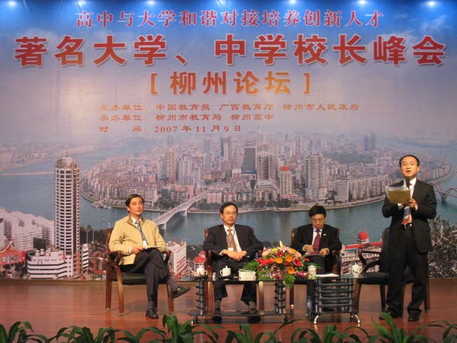 2007年11月9日上午在柳州高中會(huì)議廳舉辦可著名大學(xué)中學(xué)校長(zhǎng)峰會(huì)。此次峰會(huì)是由中國(guó)教育報(bào)、廣西教育廳、柳州市政府主辦由柳州市教育局、柳州高中承辦。以“高中與大學(xué)怎樣和諧對(duì)接培養(yǎng)創(chuàng)新人才”為主題召開(kāi)的研討會(huì)議。
