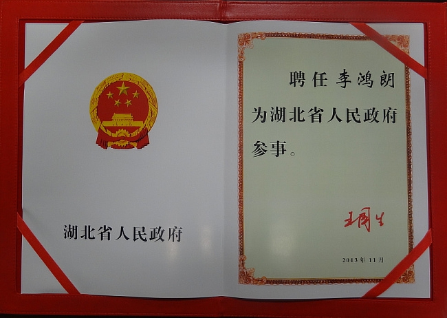 2013年11月20日,湖北省人民政府發(fā)布鄂政任〔2013〕163號通知,李鴻朗校長被聘為湖北省人民政府參事。