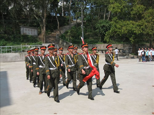 國(guó)旗班成立于三年前。國(guó)旗班“戰(zhàn)士”是從當(dāng)年參加軍訓(xùn)的優(yōu)秀學(xué)員中選拔而來(lái)的,后又聘請(qǐng)幫訓(xùn)部隊(duì)專職升旗手對(duì)他們進(jìn)行專業(yè)培訓(xùn)。在學(xué)校每周的升旗儀式上,這一抹靈動(dòng)的“軍綠”不僅是亥山腳下一道亮麗的風(fēng)景,更是休中的一張亮麗名片;他們升起的也不僅是一面鮮紅的旗幟,更是休中學(xué)子積極向上、昂揚(yáng)奮發(fā)的“精神旗幟”。