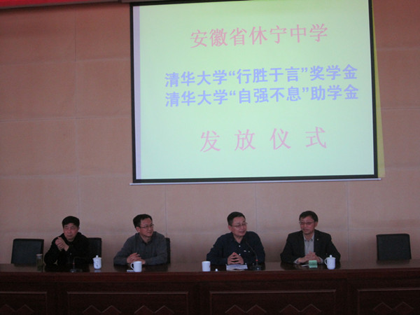 3月19日下午,休寧中學(xué)在行政樓二樓多功能教室舉行清華大學(xué)“自強(qiáng)不息”助學(xué)金和“行勝于言”獎(jiǎng)學(xué)金發(fā)放儀式,清華大學(xué)王中教授和清華大學(xué)安徽校友會(huì)代表韋志杰,我校李順寶校長(zhǎng)、毛勇華副校長(zhǎng)、政教處汪國(guó)春主任、高三年級(jí)組組長(zhǎng)賀學(xué)優(yōu)以及獲得獎(jiǎng)助學(xué)金的40名高三學(xué)生參加發(fā)放儀式。
