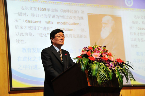 在人民教育家論壇·劉信生教育思想研討會上,劉信生校長在做《教育在不變與變之中行進》的教育思想報告