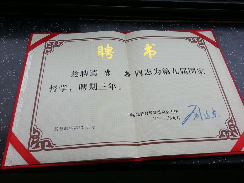 2012年10月11日,我校李新校長(zhǎng)赴北京接受教育部聘任,受聘為第九屆國(guó)家督學(xué),這是天津一中和我市基礎(chǔ)教育的光榮!