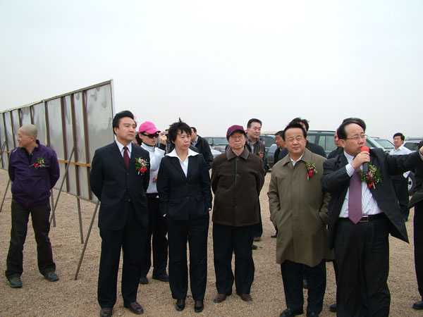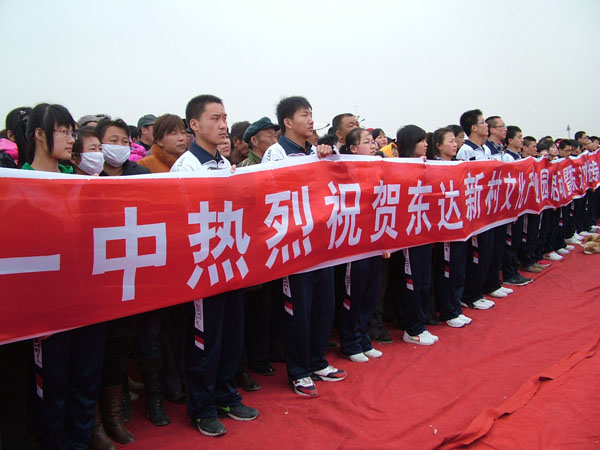 下午14時30分,我們離開酒店前往東達新村。車行1個多小時后,忽然在茫茫沙漠中看到了一大片紅頂建筑物,一排排規(guī)劃整齊的紅瓦房、一棟棟嶄新氣派的高樓,還有未入住的一棟棟別具特色的小別墅,成為風沙肆虐的荒漠中一道充滿生機的風景。大家猜想這一定就是東達新村了。果然,再往前走,我們聽到了歡快的鑼鼓聲,也看到了扭秧歌的村民。這就是東達蒙古王集團規(guī)劃投資10億元人民幣,建設12平方公里的現代化集鎮(zhèn)——東達生態(tài)移民新村。