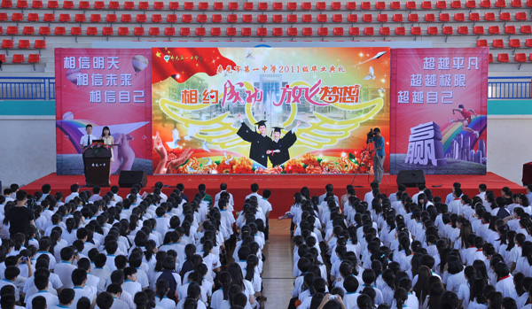 “時(shí)光飛逝,歲月荏苒。三年征途一瞬間,我們終于接近沖刺的終點(diǎn)……”伴隨著主持人動(dòng)聽的聲音,5月28日上午,我校以“相約成功 放飛夢(mèng)想”為主題的2011級(jí)畢業(yè)典禮在行健體育館隆重舉行。學(xué)校領(lǐng)導(dǎo)班子成員、中層干部、2011級(jí)全體師生和家長(zhǎng)代表3000多人參加典禮,李玉明校長(zhǎng)為2011級(jí)學(xué)生頒發(fā)畢業(yè)證書并發(fā)表熱情洋溢的講話。