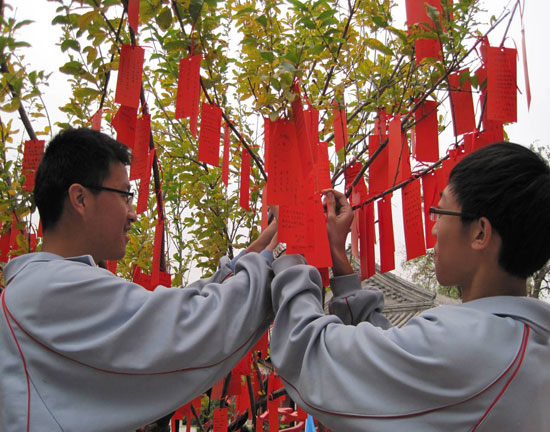 中午時(shí)分,同學(xué)們用完午餐便陸續(xù)來(lái)到教學(xué)樓前領(lǐng)取紅箋。不一會(huì)兒,心愿樹下就聚滿了人。同學(xué)們一筆一畫地寫下自己飽含真情的祝福話語(yǔ),寫下了對(duì)母校美好未來(lái)的期望希冀,然后親自將其掛上樹梢。