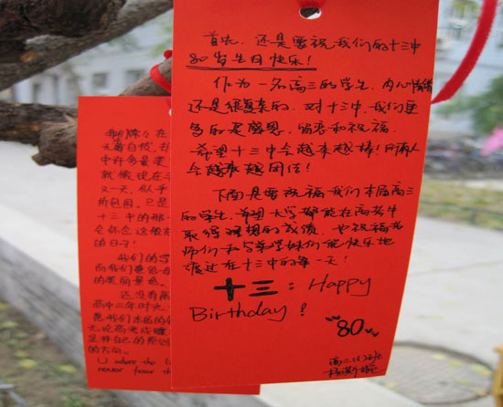 教學(xué)樓前的石榴樹上,淺色的葉子映襯著火紅的祝福,那是十三中全體師生對(duì)母校最誠(chéng)摯的深情。