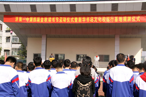 10月21日上午,濟南一中利用升旗儀式時間在校田徑場舉行了第四屆金秋讀書節(jié)啟動儀式暨新華書店文化校園行基地揭牌儀式。一中校長逄坤敬、黨委書記劉新利、山東新華書店集團有限公司濟南分公司副總經(jīng)理李運寶、泉城路新華書店副經(jīng)理梁棟、副經(jīng)理袁雪和一中全體師生參加了儀式。儀式由團委書記楊靜主持。