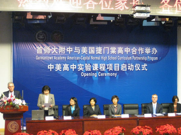 我校中美高中實驗課程項目于2012年開始與美國著名的捷門棠學校合作,捷門棠學校的大學升學指導主管Harvie Ruggules女士于10月22日起在我校開始了一對一的學生和家長面談,為了加深學生、家長對中美高中實驗課程項目的理解,兩校聯合鄭重召開項目啟動儀式。儀式在我校正志廳舉行,有的家長們甚至專門乘坐飛機趕來參加。會上我校沈杰校長、捷門棠學校校長James Connor先生、副校長Richard Schellhas先生、美國大學升學指導主管Harvie Ruggules女士都做了主題發(fā)言,并且認真地解答了家長們關心的問題。