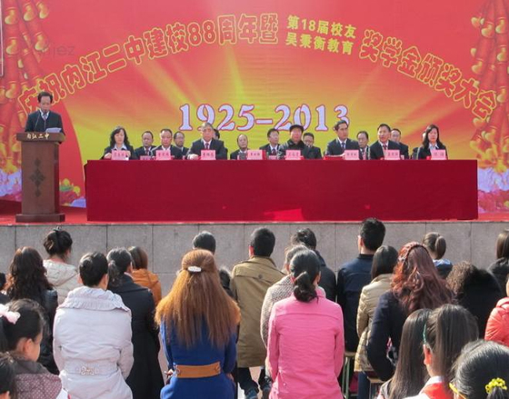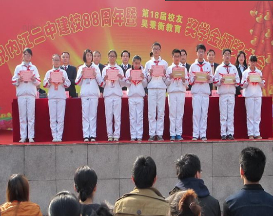 12月12日,是內(nèi)江二中的建校之日,今天全校五千余名師生員工在學(xué)校運(yùn)動(dòng)場(chǎng)歡聚一堂,隆重舉行慶祝內(nèi)江二中(原沱江中學(xué))建校88周年,并進(jìn)行了第十八屆校友獎(jiǎng)學(xué)金和吳秉衡教育獎(jiǎng)學(xué)金頒獎(jiǎng)儀式及慶校慶文藝表演。