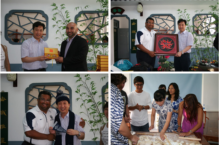 我校校長鄭若興和書記王金義在達(dá)信樓二樓竹香書苑親切會(huì)見了訪問團(tuán)一行。鄭校長首先對訪問團(tuán)來訪表示歡迎,他向客人簡要介紹了我校歷史沿革、發(fā)展現(xiàn)狀、幸福教育學(xué)校特色以及國際合作與交流等方面的情況,并對訪問團(tuán)為兩校間友好合作做出的努力表示感謝。鄭校長表示,四十五中學(xué)一直以來都致力于對外合作與交流,為推進(jìn)學(xué)校國際化營造良好的氛圍。鄭校長向來訪團(tuán)介紹了我校已連續(xù)兩年接待外籍學(xué)生、并已在蘇格蘭開設(shè)孔子課堂三年了。介紹完學(xué)校情況以后,是我校幸福課程的課程展示,胡階慶老師的《書法藝術(shù)》、李彥琴老師《中國茶藝》和李玥玖老師的《古琴雅韻》都引起了來訪團(tuán)成員的極大關(guān)注,這一環(huán)節(jié)把整個(gè)活動(dòng)推向了一個(gè)高潮。接下來時(shí)兩名教師的讀書交流匯報(bào),第五學(xué)區(qū)代表團(tuán)成員和我校匯報(bào)的老師積極互動(dòng),共同探討讀書感悟。中午,我校師生和第五學(xué)區(qū)來訪團(tuán)成員一起包餃子、吃餃子,讓他們感受中國傳統(tǒng)的飲食文化。第五學(xué)區(qū)代表團(tuán)對我校的熱情接待表示感謝,并希望以此為契機(jī),進(jìn)一步加強(qiáng)雙方間的合作與交流。