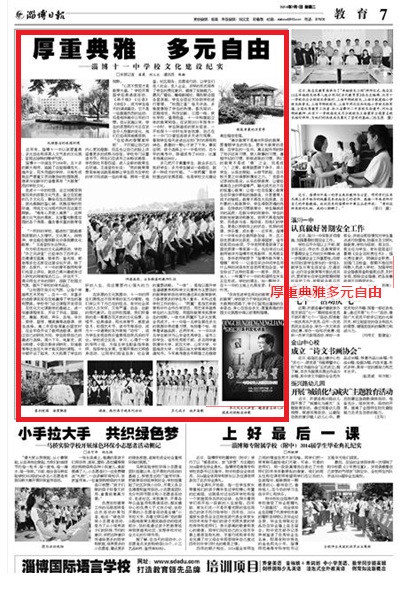 伴隨著新中國建設(shè)的腳步,淄博十一中誕生于1956年。五十多年的薪火相傳,造就了這座規(guī)模宏大,設(shè)施齊全,花木茂盛的學(xué)府,日漸形成了既莊嚴(yán)厚重又靈動激揚的校園氛圍,在繼承與創(chuàng)新中打造著具有“大教育”風(fēng)范的學(xué)校文化。