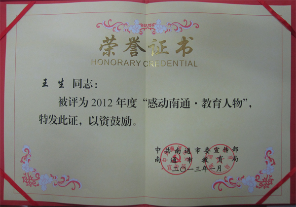 1月14日下午,由南通市委宣傳部、南通市教育局聯(lián)合開(kāi)展的“感動(dòng)南通·教育人物(群體)”評(píng)選活動(dòng)頒獎(jiǎng)大會(huì)在南通市行政中心報(bào)告廳舉行,我校王生校長(zhǎng)獲評(píng)“感動(dòng)南通*教育人物”。