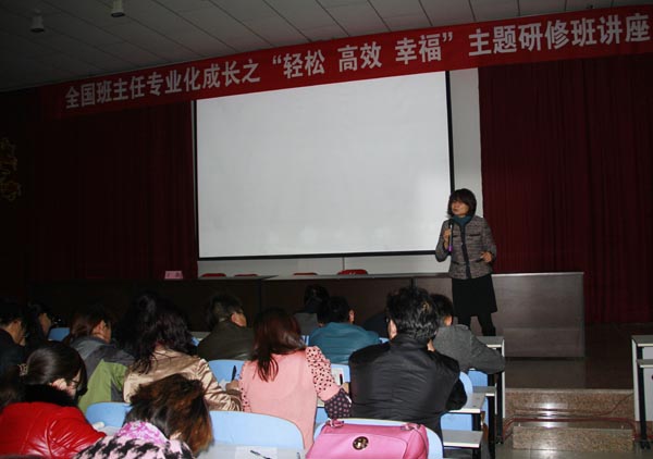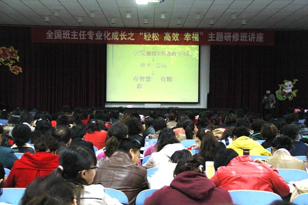 2013年10月19日全天朱洪秋老師圍繞《積極思想引領(lǐng)下的幸福教育》、《學(xué)生心靈教育經(jīng)典案例分析》、《班級自動(dòng)化管理》、《如何做一名幸福的班主任》等主題展開了深入的講解和剖析,他的講座深入淺出,傳達(dá)了幸福教育的新理念,他所舉案例鮮活,都是我們班主任經(jīng)常遇到的,對案例的分析精確具體,處理方法科學(xué)有效,對班級管理的一系列制度方法措施精細(xì)到位,對班級自動(dòng)化管理有很好的指導(dǎo)和借鑒意義。2013年10月20日上午王淑清老師就《三嚴(yán)工作,創(chuàng)優(yōu)自己——中小學(xué)教師專業(yè)發(fā)展的思考與實(shí)踐》主題進(jìn)行講解,她就北京市“巨山小學(xué)”成功的教育管理經(jīng)驗(yàn)進(jìn)行了傳授和剖析。2013年10月20日下午田萬生老師就《教師的自我成長》從心理學(xué)和生命價(jià)值的角度進(jìn)行了講解,他的講座風(fēng)趣幽默,引人入勝,歡快輕松,引導(dǎo)教師在體驗(yàn)和感悟中加強(qiáng)自我專業(yè)化的成長??傃灾?,他們的講座不時(shí)引起老師們的共鳴和熱烈掌聲,兩天的時(shí)間,580余名教師善始善終的聽講和做筆記,老師們在思考與反思中收獲,在歡愉與充實(shí)中進(jìn)步,在每場培訓(xùn)結(jié)束時(shí)從老師們露出的自信和愉快的表情說明此次班主任研修培訓(xùn)活動(dòng)對班主任工作一定有很大幫助。
