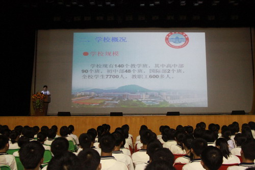 最后,王校長簡明扼要地向新生們介紹了如何評價一所學校的高考成績。通過高一學生入校成績與高三畢業(yè)時高考成績對比、高考指標的完成情況、入讀國內一流大學人數(shù)以及教研室每年的教學質量評價這四方面的數(shù)據(jù),讓新生們通過一個客觀的角度看到了一中堅的實實力,更加堅定了自己對一中的選擇。
