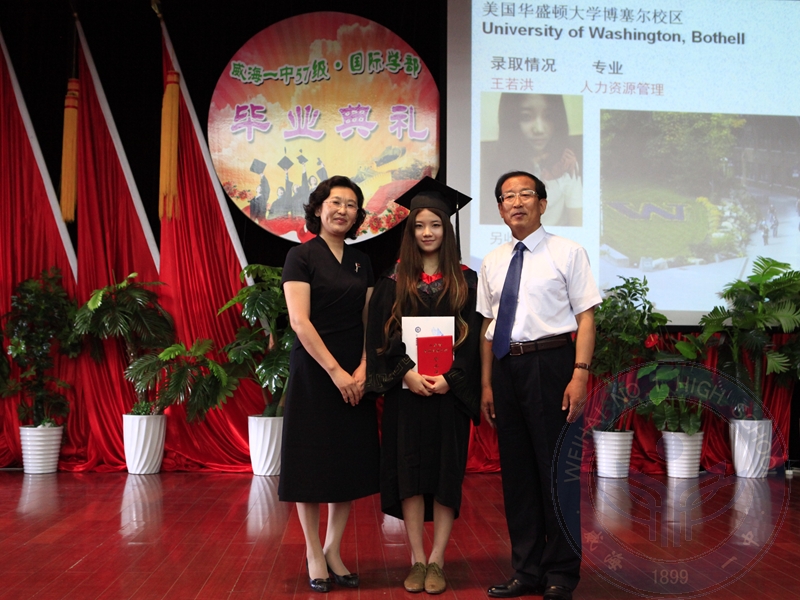 隨后,學(xué)生們身著畢業(yè)袍,帶著喜悅的笑容從王義君校長和苗芃委員手中接過畢業(yè)證書和畢業(yè)紀(jì)念冊,與校長合影留念,與此同時,大屏幕上閃現(xiàn)著該生被國外大學(xué)錄取的情況。威海一中國際學(xué)部首屆畢業(yè)生38人,共計收到國外大學(xué)錄取通知書90余份,累積獲得獎學(xué)金62.4萬美元。全場掌聲陣陣,熱烈而誠摯的祝賀著每一位同學(xué)獲得的優(yōu)異成績。這份喜人的成績背后凝聚著國際學(xué)部師生三年不懈的努力和奮斗的汗水,威海一中國際學(xué)部的首屆畢業(yè)生用這出色的成績?yōu)榘倌暌恢性鎏砹诵碌臉s耀。