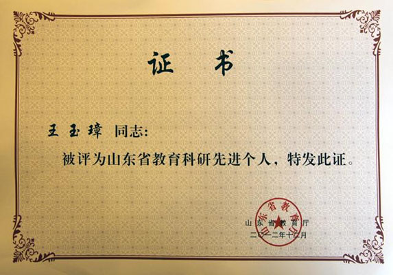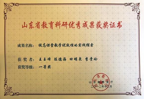 2013年5月23日至24日,山東省第五屆教育科研工作會議在青島市隆重召開。山東師大附中校長王玉璋被評為“山東省教育科研先進(jìn)個人”,由王玉璋、陳德海、田明泉等人共同完成的《提高課堂教學(xué)優(yōu)效性的實踐探索》研究報告被評為“山東省第五屆教育科研優(yōu)秀成果一等獎”。