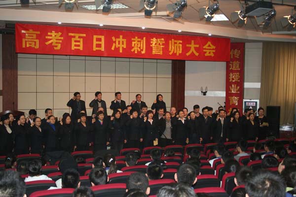 大會由高三年級主任左文靜老師主持,高三年級教師代表陳麗娟老師,學(xué)生家長代表和學(xué)生代表劉華清分別進行了發(fā)言,接著同學(xué)們用錚錚誓詞表達了高三所有學(xué)生的雄心壯志:“目標明確,積極向上。勤學(xué)苦練,斗志昂揚。頑強拼搏。不棄不放。全力以赴,創(chuàng)造輝煌?!薄瑢W(xué)們激勵昂揚,喊出理想,喊出決心。魏立新校長在會上作了熱情洋溢的講話,對全體高三年級的同學(xué)們寄予了殷切的期望,并鼓勵全體同學(xué)面對強者要勇于亮劍、鼓足干勁、迎難而上、注重方法、提高效率、為自己的幸福人生、為自己的輝煌未來而努力奮斗。最后全體高三年級教師在余麗娟老師的帶領(lǐng)下,莊嚴地喊出了誓言:“我們一定會:忠于職守,精誠團結(jié);言傳身教,以身作則;我們有負重拼搏的精神,我們有勇奪桂冠的信念。我們要與孩子們風(fēng)雨同舟;我們愿為孩子們保駕護航。讓我們一起滿懷激情,決戰(zhàn)高考!”