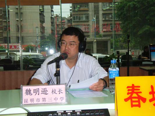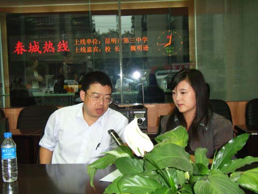 2009年6月23日(周二)早晨7點10分至8點,昆明市第三中學校長---魏明遜走進了《春城熱線》直播間,就昆明市第三中學的師德師風建設、教育教學質量、學生素質教育、招生計劃、學科建設等問題與聽眾朋友們進行了對話交流。