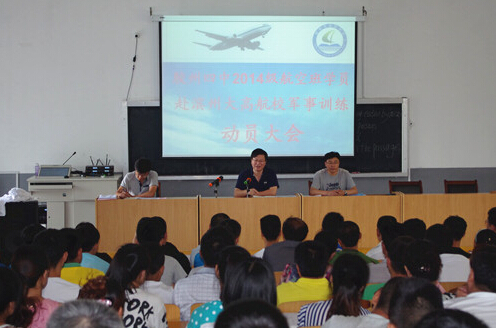 7月14日上午,2014級航空班新學員懷著喜悅的心情在家長的陪同下到膠州四中報到。學校在階梯會議廳召開了航空班學員赴濱州大高航校軍事訓練前期動員會。
