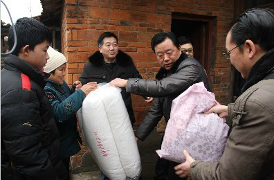 在廟前鎮(zhèn)煙集村文龍家里,兩間低矮的簡(jiǎn)易瓦房,多年失修,漏雨、潮濕,房間連房門(mén)都沒(méi)有一塊,但是墻上貼滿(mǎn)了獎(jiǎng)狀。當(dāng)陽(yáng)一中校長(zhǎng)徐家森將慰問(wèn)金2000元及自己購(gòu)買(mǎi)的棉被交到文龍母親文世俊手里。宋萬(wàn)明將準(zhǔn)備的年貨:2袋大米、2壺油、一袋豬肉悄悄放在灶臺(tái)旁。李國(guó)兵現(xiàn)場(chǎng)捐款2000元。